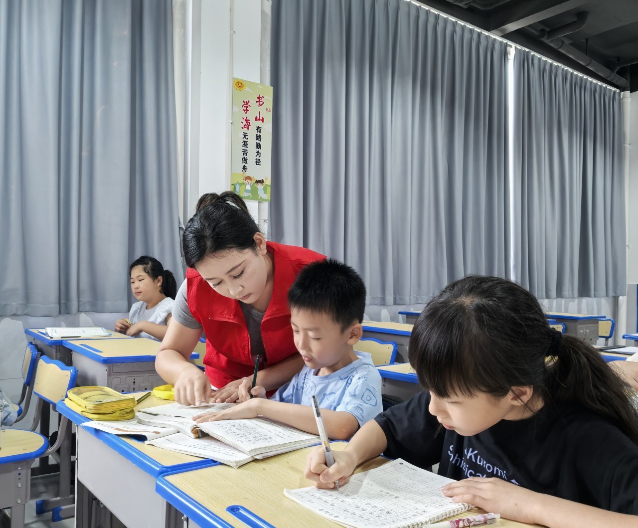 “蒋老师,这道数学题我做不来,您给我讲讲呢?”“好嘞,这道题应该……”教室内,蒋汶芳和田小雨弯下腰,一边拿着笔在书本上勾画,一边认真地用自己的专业知识为孩子们讲解暑假作业。