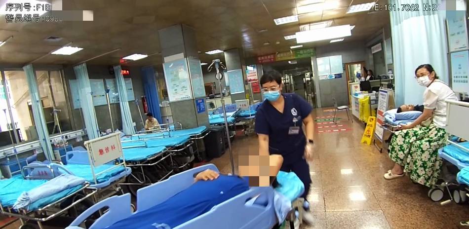 到达医院后,同车的乘客立刻上前,和交警、通勤车驾驶员一起协助医护人员,将患者抬上担架进行急救。