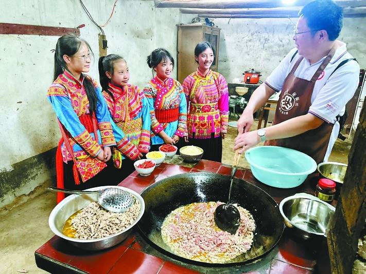 20分钟后,面包车抵达松柏村。村寨的男女老少都来了,张正祥家的院子里充满了欢声笑语。金高峰系上围裙走进厨房,开始教孩子们炒菜:“肉丝要先过油,火不能太大……”志愿者李明辉蹲在灶前,和即将去成都读书的受助学生吉云飞谈着学业规划。