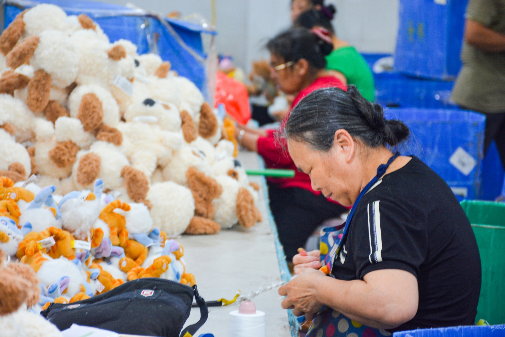晶鹏动漫厂房内,工人正在制作毛绒玩具。