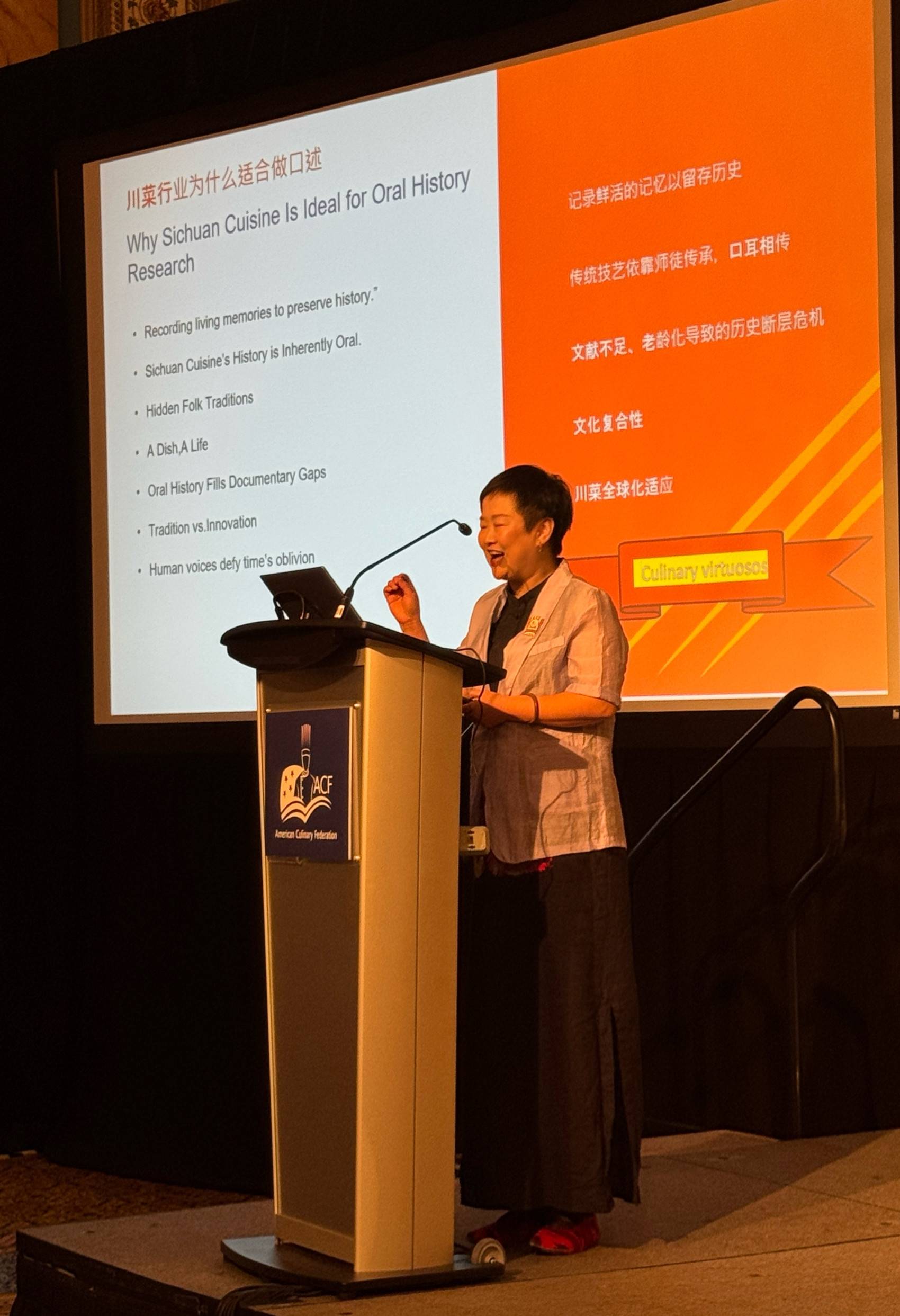 “我和我的前辈们都怀揣着同一个目标:让美食连接世界,让世界爱上川菜,爱上中国美食。”作为口述历史研究者的陈妍把自己研究成果带到了ACF会议现场。她以“透过普通人的个体化叙事,让世界感知川菜”为核心,系统阐释了团队通过田野调查、影像记录与口述访谈抢救川菜技艺的实践路径。