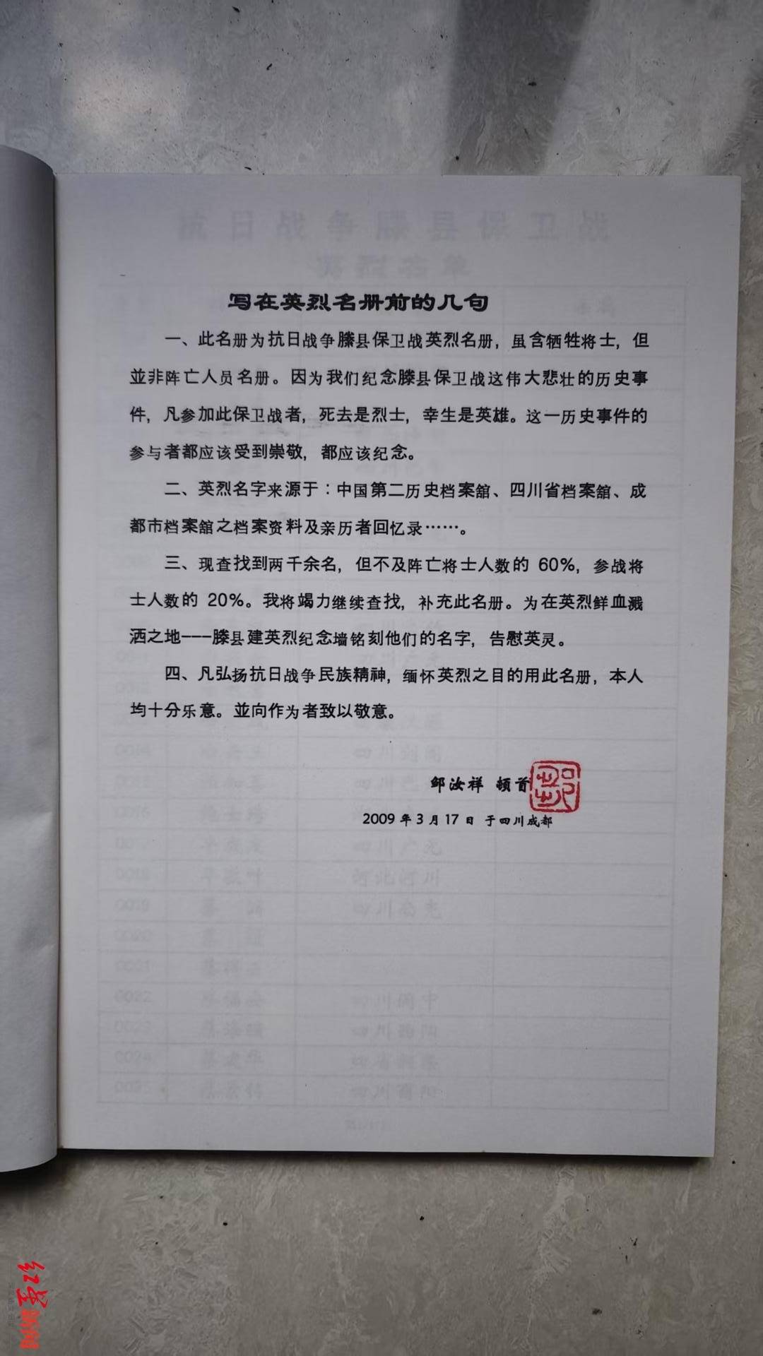 在邹汝祥离世前,已完成滕县保卫战中2160名英烈(部分)名单收集,并将滕县英烈资料编撰成《抗日战争滕县保卫战英烈名册》。此后,这份名单连同他翻拍的邹绍孟家书照片一起被捐给建川博物馆之川军抗战馆以作永久纪念。