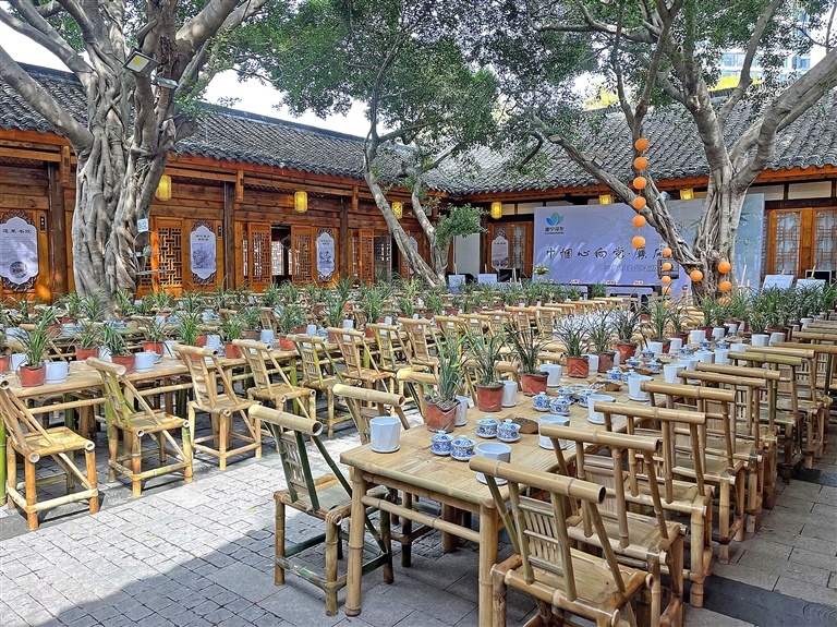 今年春,旗山书院与多个旅行社合作,每天都有数辆大巴车停靠于此。游客们一边品茗一边看非遗演出,享受遂宁安逸的慢生活。