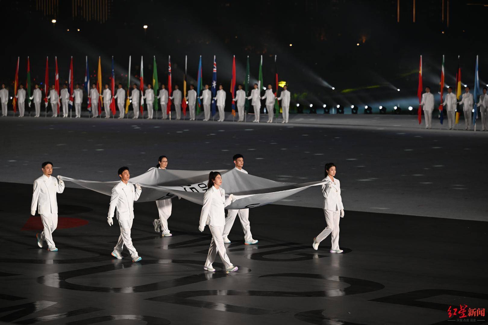 作为本次开幕式仪式中的重要环节,在运动员入场环节,首次采用贯穿式入场方式。其中,火炬手、执旗手阵容强大——丁俊晖、董栋、高敏、张雨霏、汪顺、潘展乐、黄张嘉洋、潘晓婷等,众多大家熟悉的面孔。