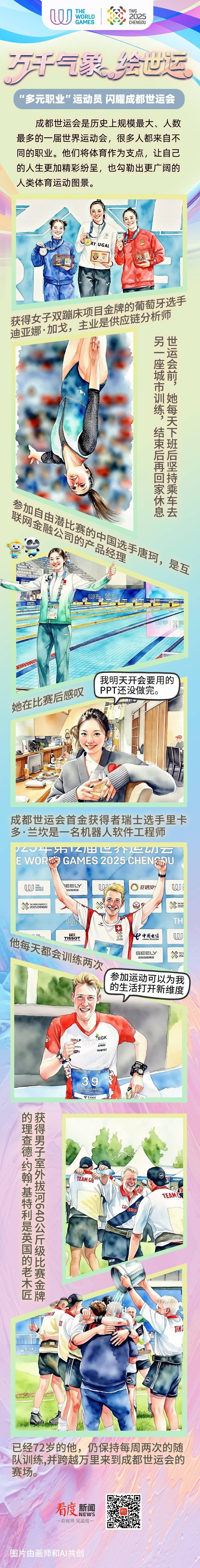 成都世运会AI创意绘画《万千气象·绘世运》系列,今日推出“‘多元职业’运动员 闪耀成都世运会”,一起来感受他们多彩丰富的人生。