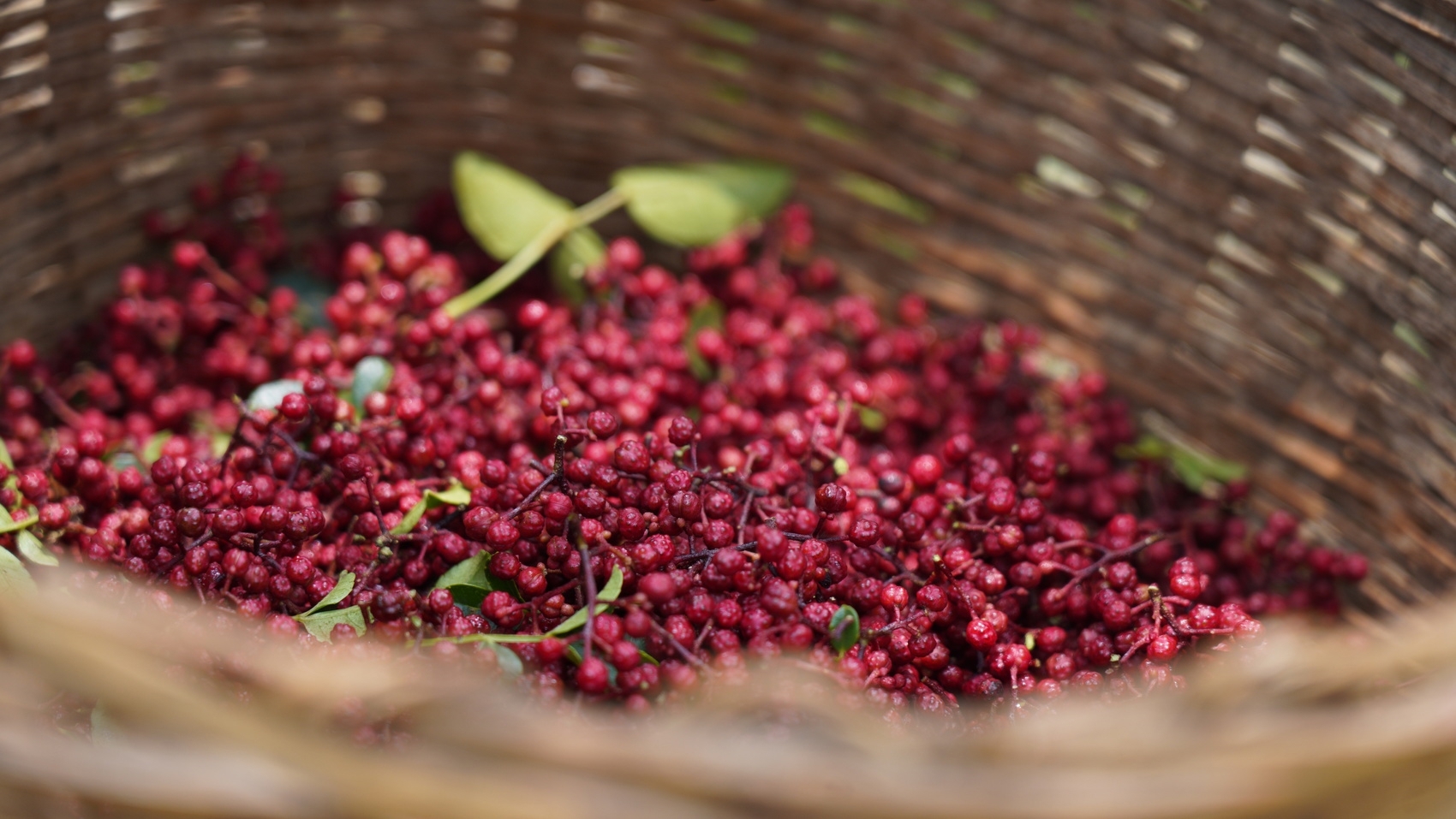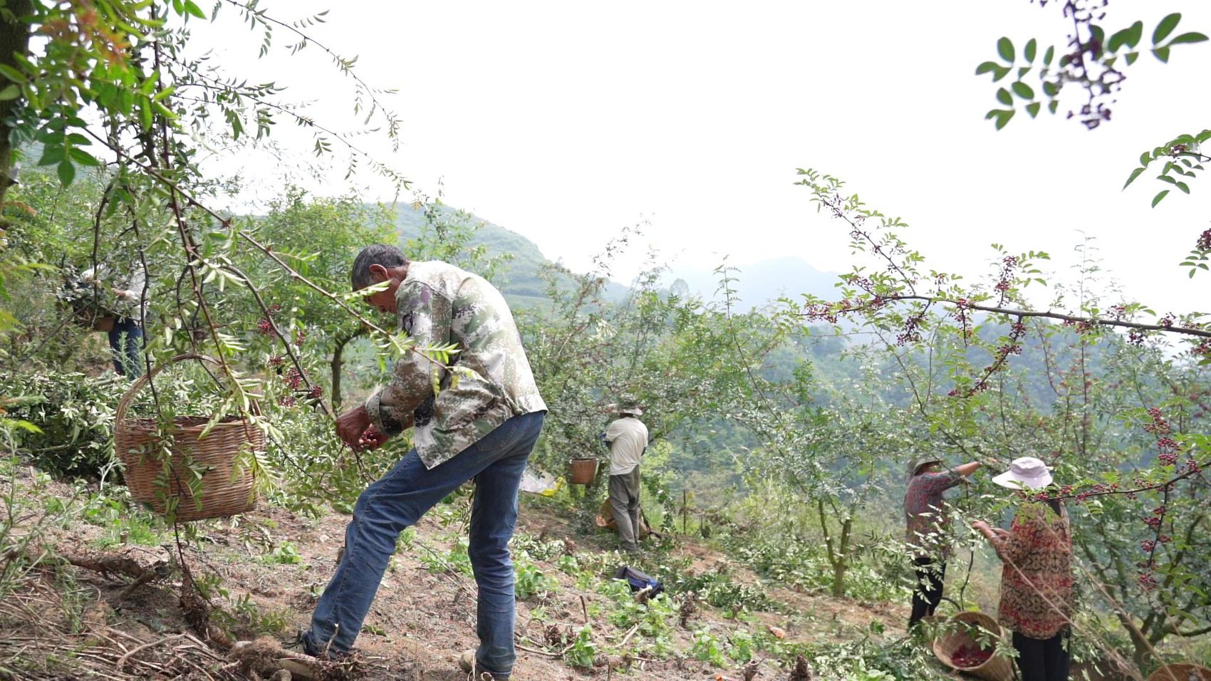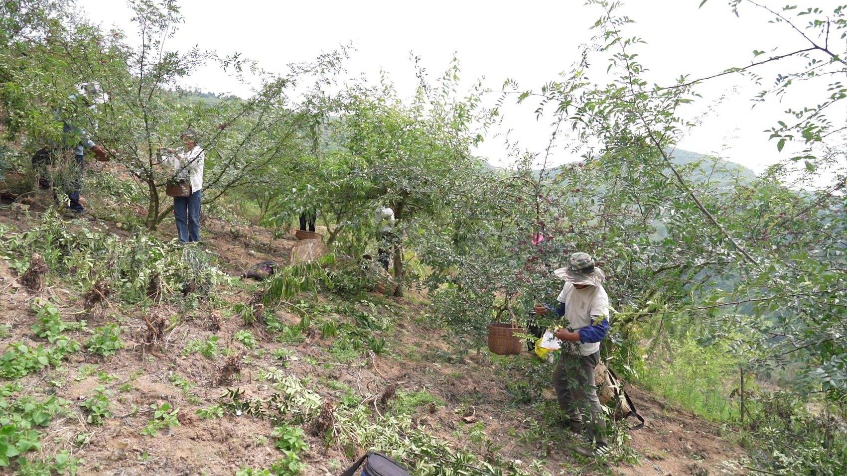 每天天刚亮,二十多个工人就扛着竹篮来地里了,有附近村的,也有邻镇来的。大家分散在林间,指尖在枝条间翻飞,成熟的花椒被麻利地摘进篮里,不一会儿就堆起个“小山尖”。