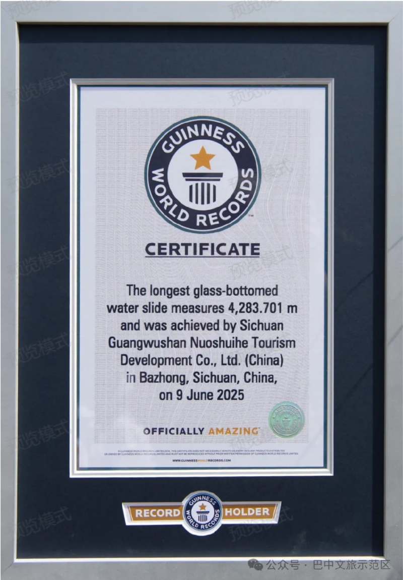 光雾山高山水滑道吉尼斯世界纪录证书 图片来源:巴中文旅示范区微信公众号