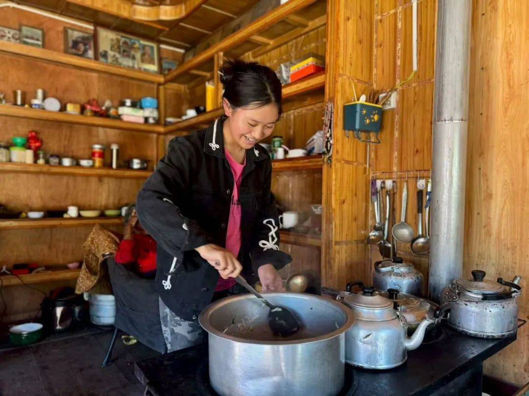 卡波家的新居就在古碉楼隔壁。记者到访时,20岁的秋吉正在帮厨做饭。她是卡波的孙女,在青海上职校:“爷爷总说碉楼是红军留给我们的财富,几年前政府帮我们建了新家,装了热水器、洗衣机,还有了独立的浴室和卫生间,全家再不用挤在昏暗碉房里。”