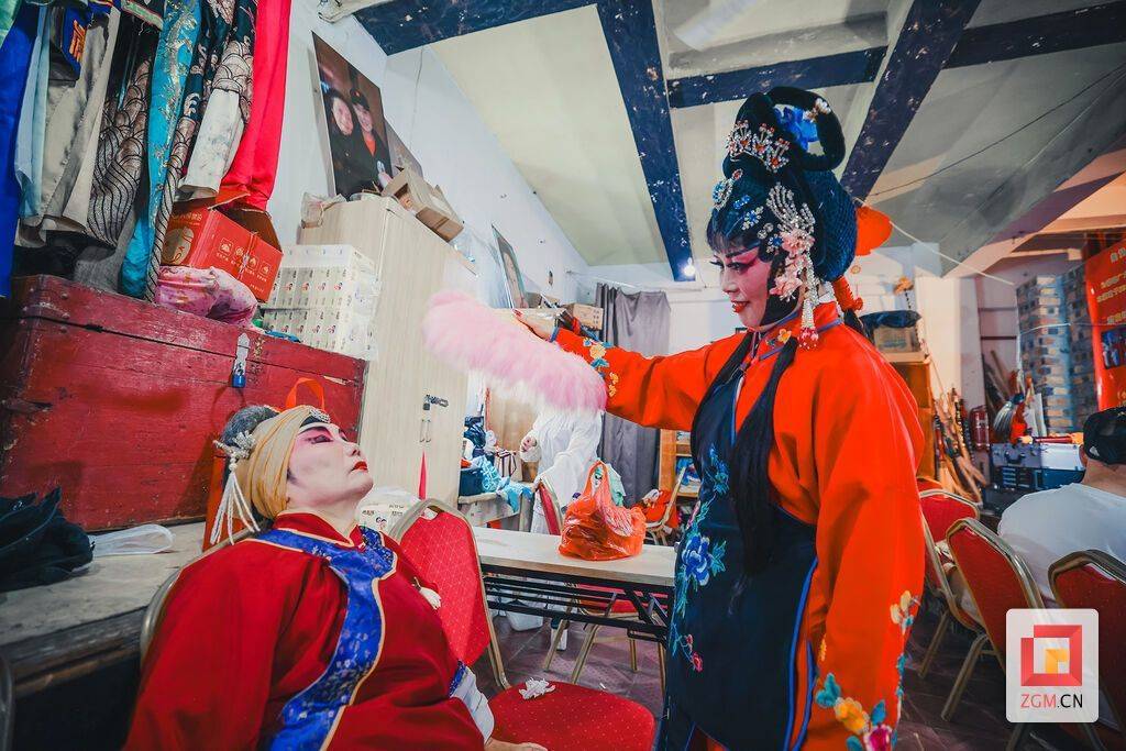 上场前互相检查一下行头是否有疏漏,是戏班的老传统,也是一份无声的加油打气,承载着“台上见”的信任与托付。记者 宋姿熠 摄