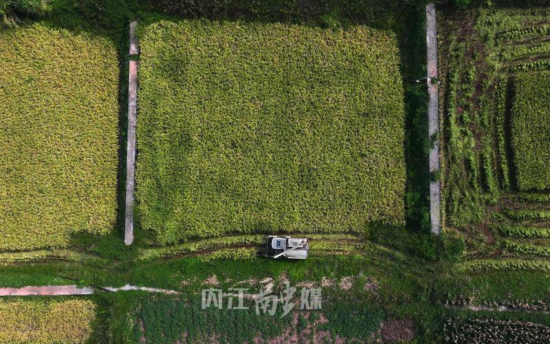 8月21日早晨7点半,内江市隆昌市石燕桥镇三合村,晨光铺满乡村大地,沉甸甸的稻穗在微风中摇曳,泛起金色的波浪。荷花塘边的稻田里,两台收割机在阳光下闪耀着金属光泽,“突突突”的引擎声打破了村庄的宁静。