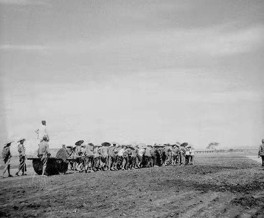 ▲民众推拉石碾修建机场