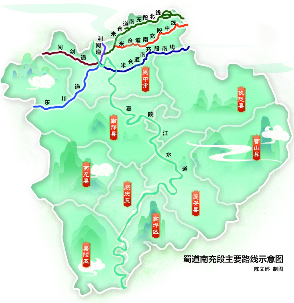 蜀道在南充境内主要分布有东川道、利阆道、阆剑道、米仓道、嘉陵江水道、东河水道等,涉及今阆中、南部、仪陇、蓬安、顺庆、高坪、嘉陵等区县。
