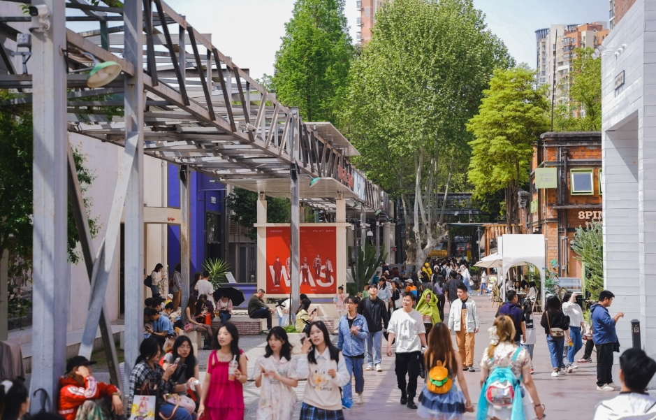 走进成都东郊记忆·国际时尚产业园,苏式红砖厂房、蒸汽式火车头、烟囱管廊水塔等工业遗迹,与数字文创、潮牌快闪店、艺术咖啡馆等潮流店铺并肩而立,各种雕塑、艺术装置点缀其间,高耸的水泥塔里举办着先锋艺术展,旧锅炉房变身为LiveHouse……工业风与潮流文化在此碰撞交织,曾是老成都的工业心脏“红光电子管厂”,如今化身为成都“时尚C位”,形成对年轻人强大的“潮”引力。