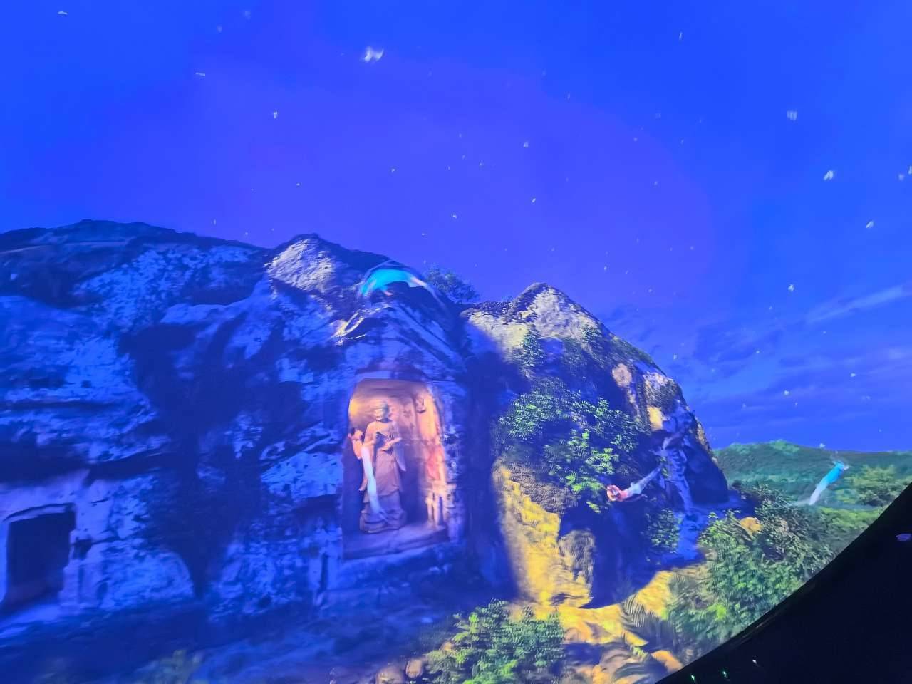 “通过创新技术手段,我们将1000余处摩崖造像的千年风华转化为可触摸、可交互的沉浸式体验,让古老的佛像与壁画焕发出新的生机。”安岳石窟数字展示中心负责人李忠良介绍,数展中心运用Mapping投影、手势感应、脑电波交互及AI算法等前沿科技,精心设计了“唐宋吹来的风”、“隐逸山间的佛”等主题互动体验区,特别是数字影院配备了四联屏的Boxfilm沉浸式影院与3D8K球幕影院,为游客带来前所未有的视听享受。专门上映的史诗级光影电影《山岳颂安》,通过震撼的视觉效果与深情的旁白,将安岳石窟的千年历史与文化底蕴娓娓道来,让游客在沉浸式的观影体验中,深刻感受到千年石窟文化的独特魅力与深远影响。