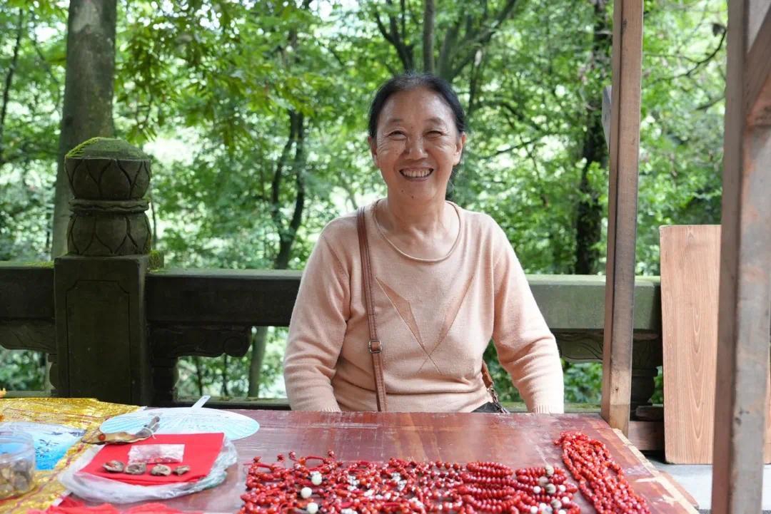 在红豆树的浓荫下,零星散布着几个小摊,摆着红豆制成的手链与挂饰。起初不见摊主,待有游客驻足,她才快步赶来招呼。