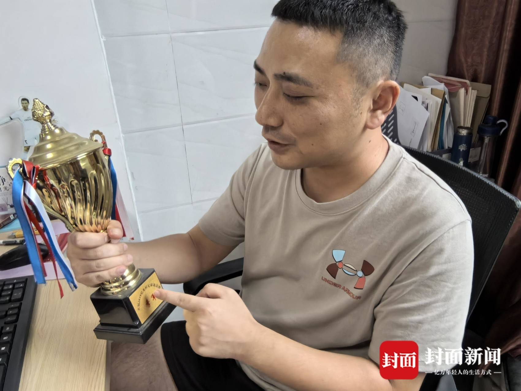 陈龙展示自己的球队在参加达州周末足球联赛获得的奖杯
