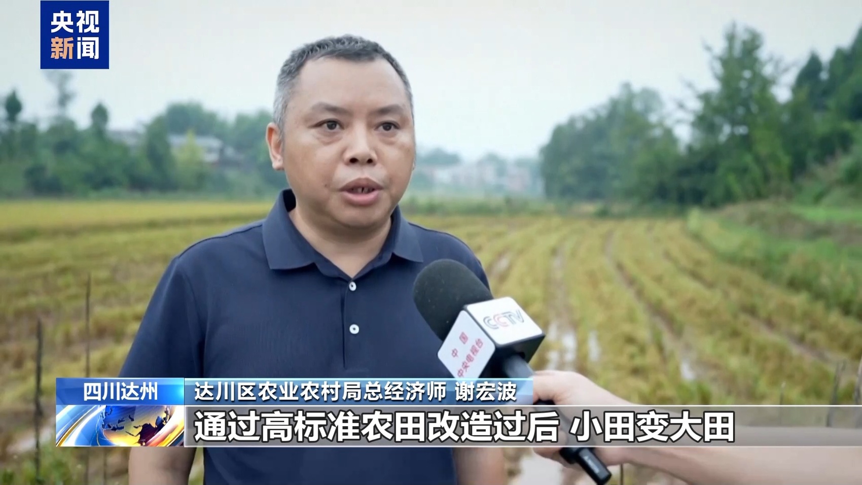 达川区农业农村局总经济师 谢宏波:通过高标准农田改造后,小田变成大田。现在能排能灌,一年可以种两季,机械化作业程度非常高,两季都能够获得丰收。水稻的单季产量相比以前,每亩至少增收30公斤以上。