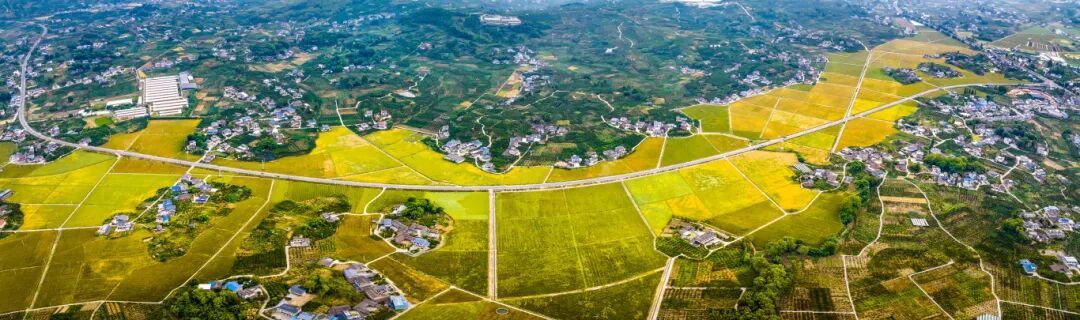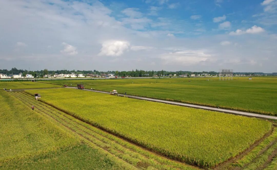 同样,在丹棱县仁美镇安溪河畔约2000亩的退园还耕示范基地内,金色稻浪随风起伏,联合收割机田间驰骋。从高处俯瞰,这些稻田与蜘蛛网般的路网,以及错落有致的农房、果园构成了一幅立体绝美的乡村图景。