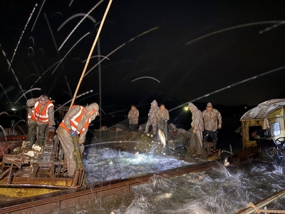 工作人员与经销商默契配合,将渔获快速倒进分拣池,按白鲢、花鲢、鲫鱼等品种分类,再用专用网兜称重、计数。整个分拣过程不超过1小时,完成分类的鲜鱼随即被装入带有充氧装置的水箱,由专用保鲜车运往城区。