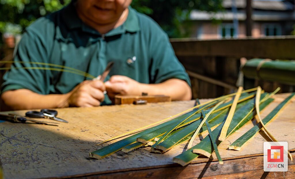 竹子运回工作室后,便进入关键工序——拌料。这道看似简单的步骤,凝结着龚家五代人的智慧。“这是我父亲龚玉文的革新。”龚道勇语气中带着敬意。过去,爷爷那辈制扇需现砍现撕竹丝,受季节限制很大。如今将竹筒破成胚料浸泡保存,便可随时取用,让技艺传承不再受时令束缚。
