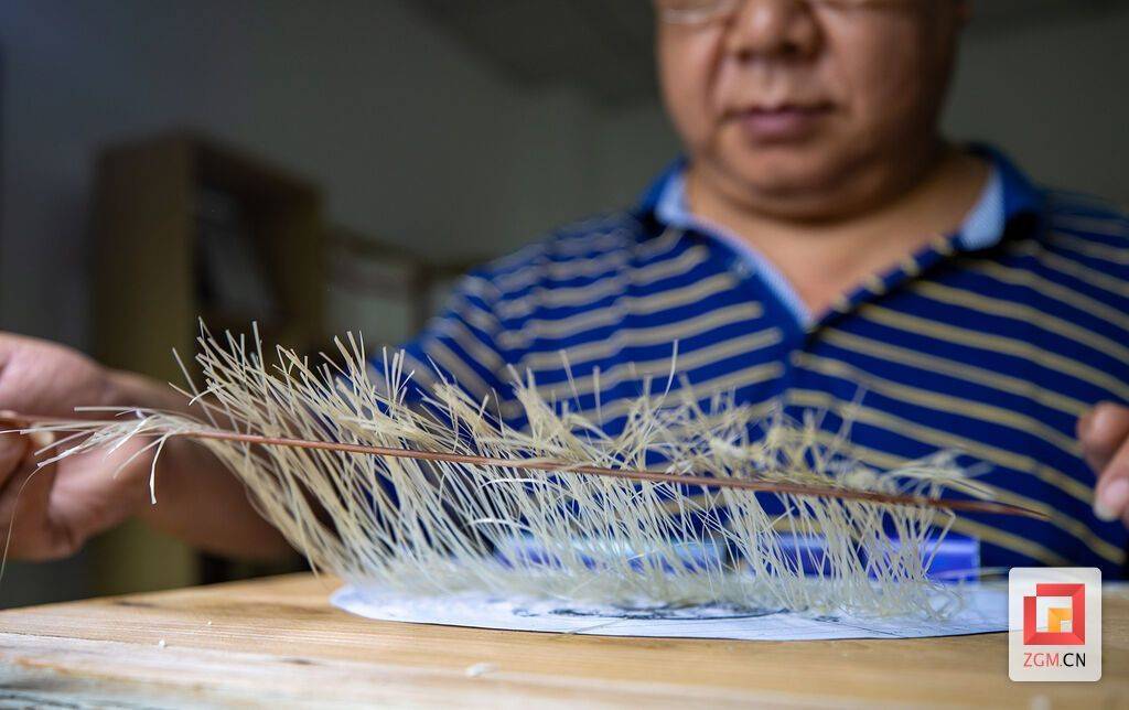 执起特制的刀具,他将竹料分割成均匀的细条。刀锋轻舞,竹屑如雪花般纷飞,逐渐露出薄如蝉翼的竹丝。“龚扇分为中档、高档、精品三个规格。精品扇的竹丝必须薄至0.01毫米,不到头发丝厚度的七分之一。在我创新之前,还没有‘精品’这一档。”他一边说,一边用指尖轻抚竹丝,全凭手感控制均匀度,“力道稍偏,竹丝即断。光是刮制一把扇子所需的竹丝,就要耗去半个月光阴。”