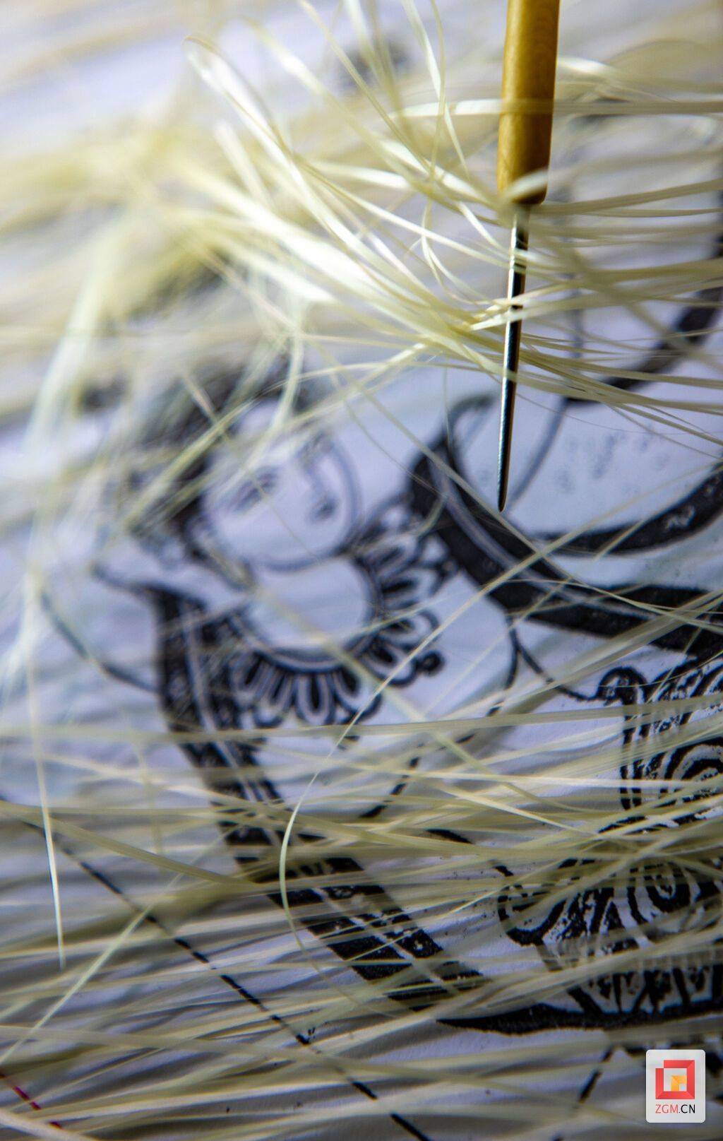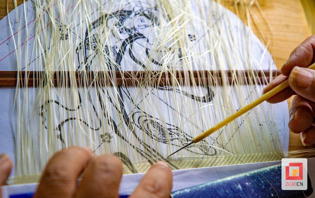 展开《飞天》画卷,千根竹丝依深浅排列,犹如调色盘上细腻的色阶。龚道勇的手指在竹丝间轻盈穿梭,挑、穿、压、破,每个动作都优雅如舞。最令人称奇的是“破”的技法——用拨针将本已极细的竹丝再分两半,用以勾勒飞天最微妙的神韵。“竹丝自有脾气,热胀冷缩,要像对待恋人般细心呵护。”言及此,他不禁想起代表作《箜篌图》中的十二根斜弦,“要让斜弦编得笔直如丝,更是难上加难。”