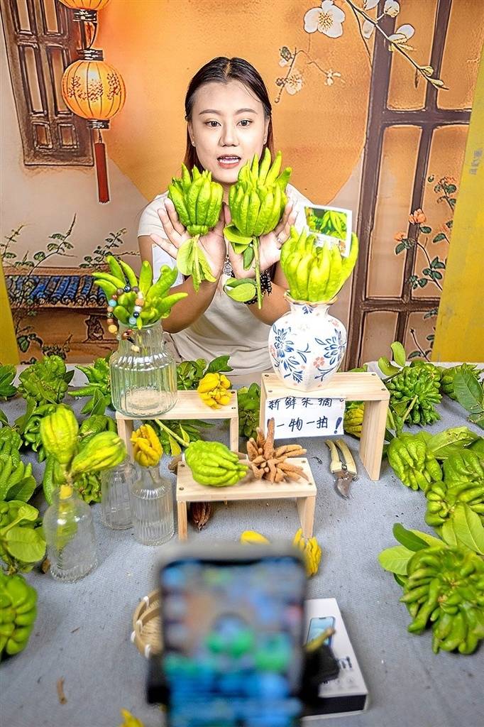 蓬溪县蓬南镇川馥佛手产业园内,电商主播正在线上销售刚刚采摘的新鲜佛手。全媒体记者 吴奉家 摄