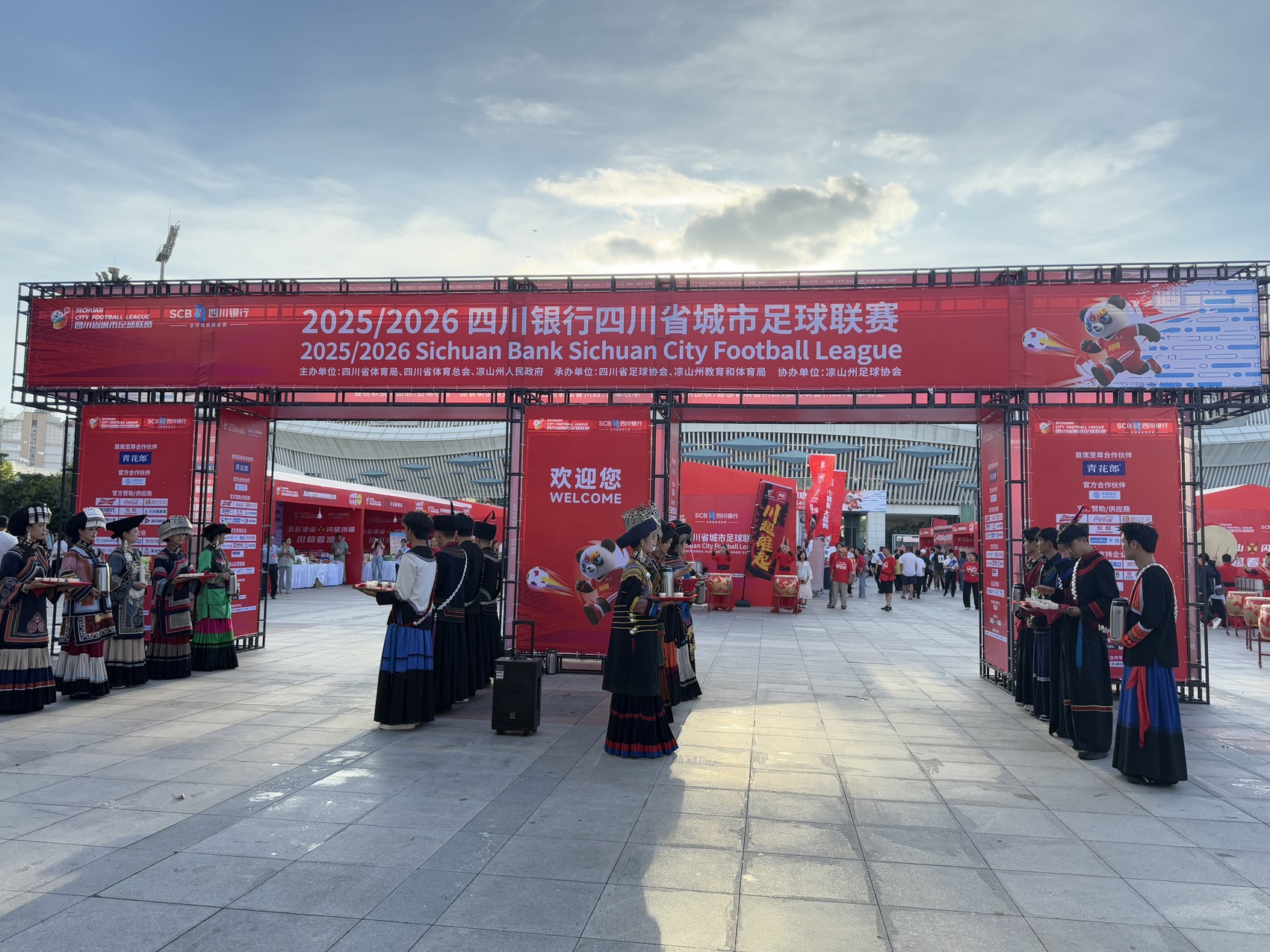 距离比赛开场还有3个多小时,凉山民族体育场外的“川超农文商市集”已“热情如潮”。入口处,身着彝族服饰的青年手捧纸杯装苦荞茶,向入场观众敬献民族迎宾礼。这里,不仅仅是球迷们赛前消遣的去处,更是一个微缩的、动态的“魅力凉山”博览会。