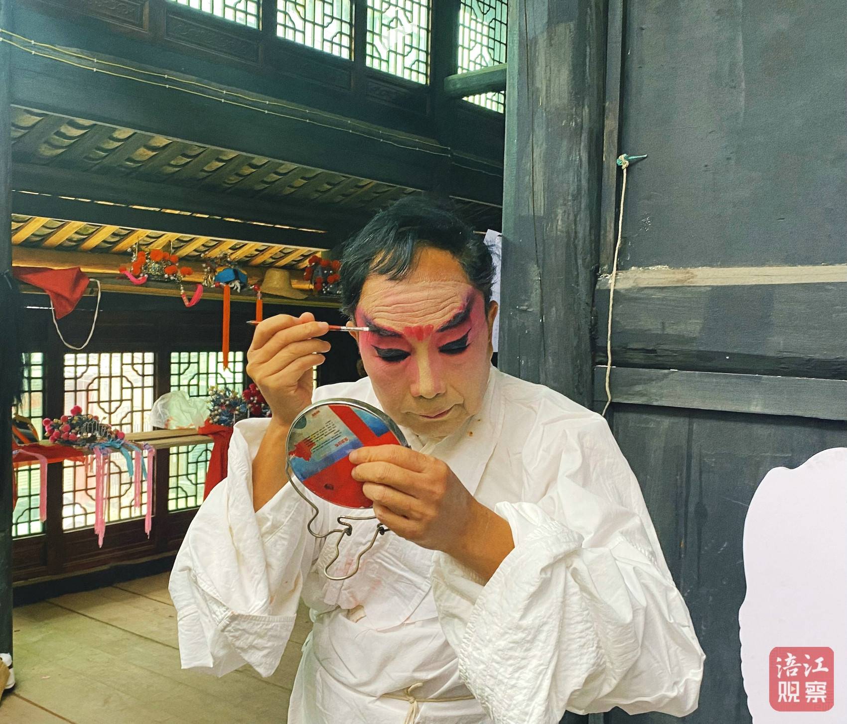 在一处简陋的后台,绵阳市梨园川剧团团长周祥新对着一面小梳妆镜勾脸,笔尖游走于眉宇之间,朱砂点染、金粉闪烁,一出好戏悄然酝酿。年过花甲的周祥新学戏已有40年,热情丝毫不减。“现在我们也与时俱进尝试创新,让变脸、吐火、水袖、滚灯这些绝活多进校园,培养小观众、小演员,毕竟川剧的将来,得从娃娃抓起!”周祥新说。