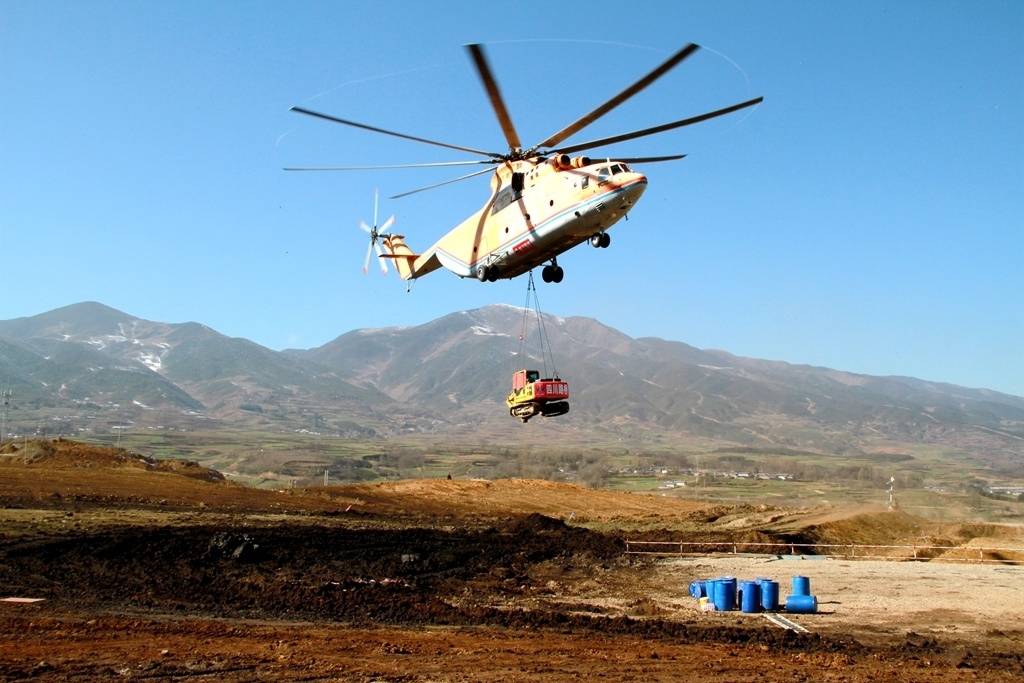 米-26重型运输直升机吊运挖掘机“空投”到阿布洛哈村。
