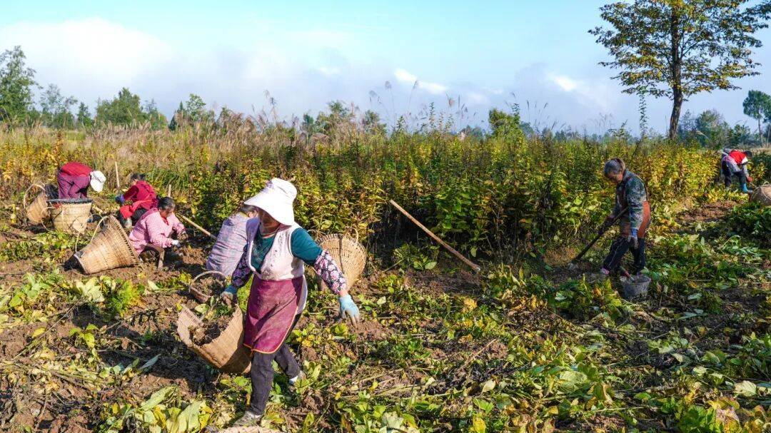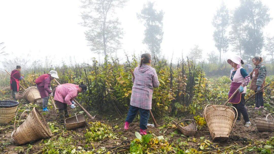 冬日清晨,巴中市平昌县青云镇青林社区晨雾还没散尽,山梁上中药材种植基地的玄参田里已经热闹开来。20余名社区居民三五成组,躬身挥锄,带着泥土气息的玄参被连根挖出,轻轻地放进背篓。