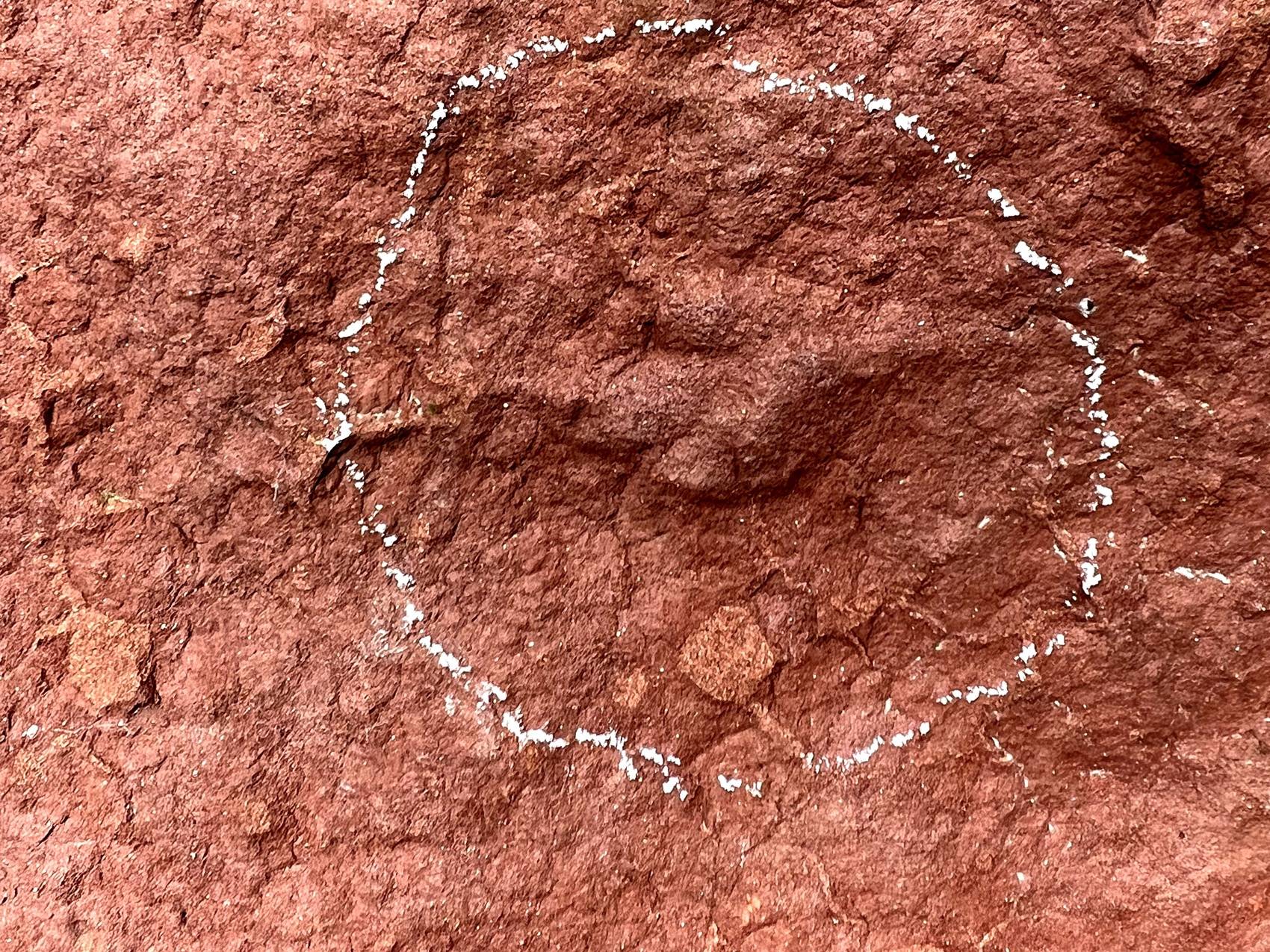看似平淡无奇的砂岩石平面,几个凹凸有致的图案,经地质专家用粉笔描画,轮廓逐渐清晰,再用几条线连接,一组形似动物运动行迹的示意图便跃然石上。