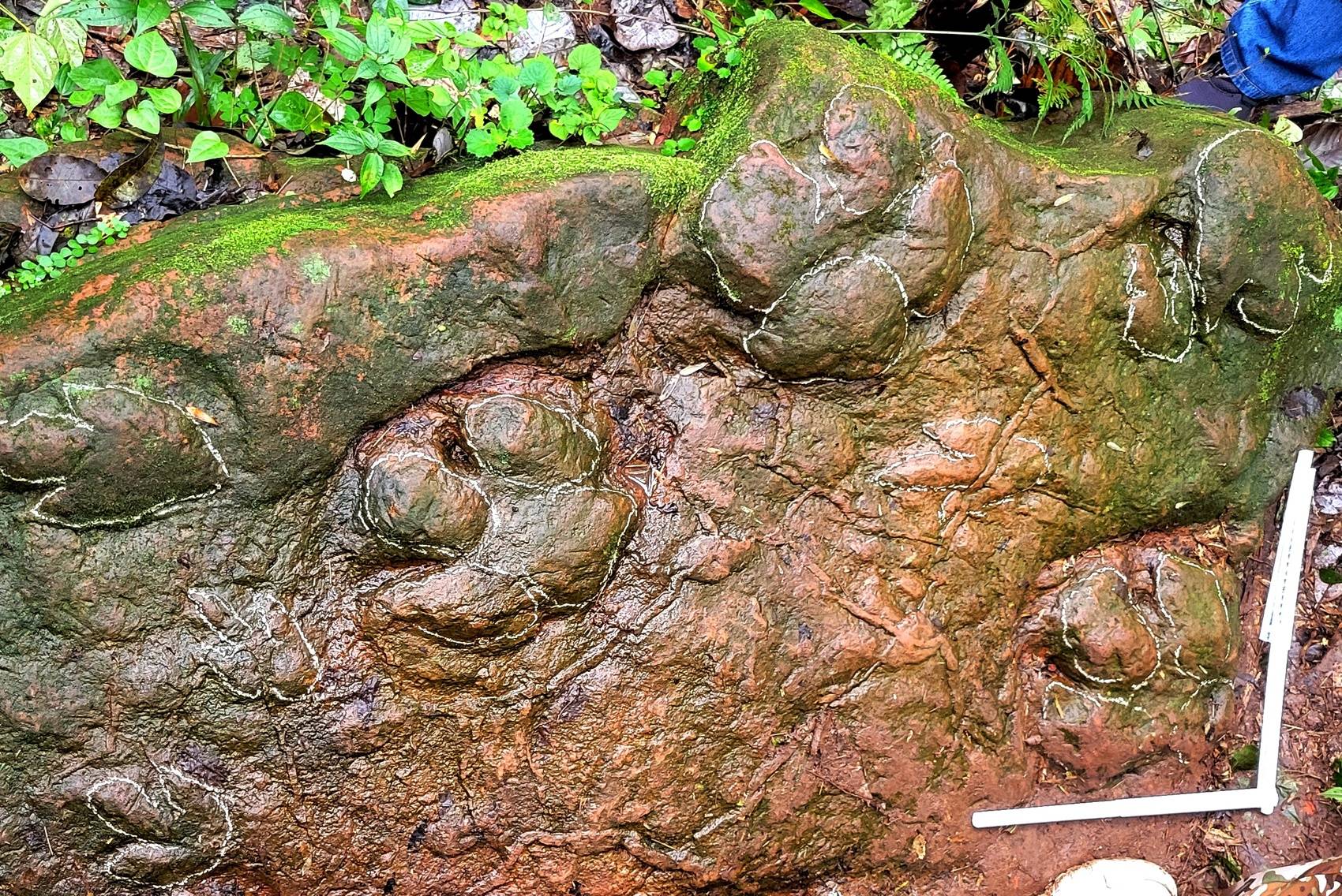 石头上发现“鸡爪”,黄荆镇政府工作人员徐挺得知消息后,专程到现场了解情况。结合其团外形,基本确定这些“鸡爪”就是恐龙足迹。