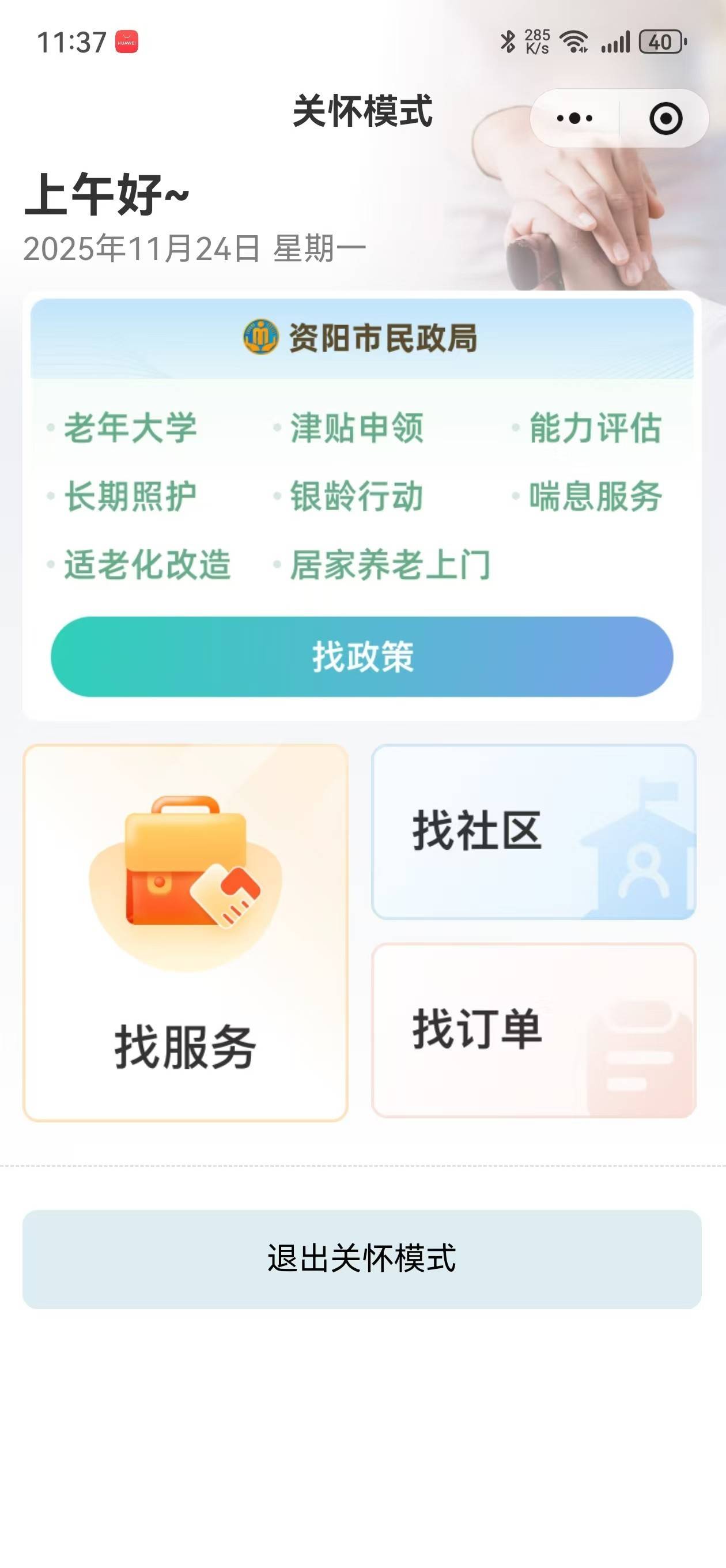 打开“资阳数智康养”微信小程序,助餐、助浴、陪诊、卫生护理、康复辅具租赁等生活服务功能已全面上线。目前,资阳正积极推进首批优质商家进驻平台,重点引入资质优良、品牌影响力强、服务能力突出的市场主体。