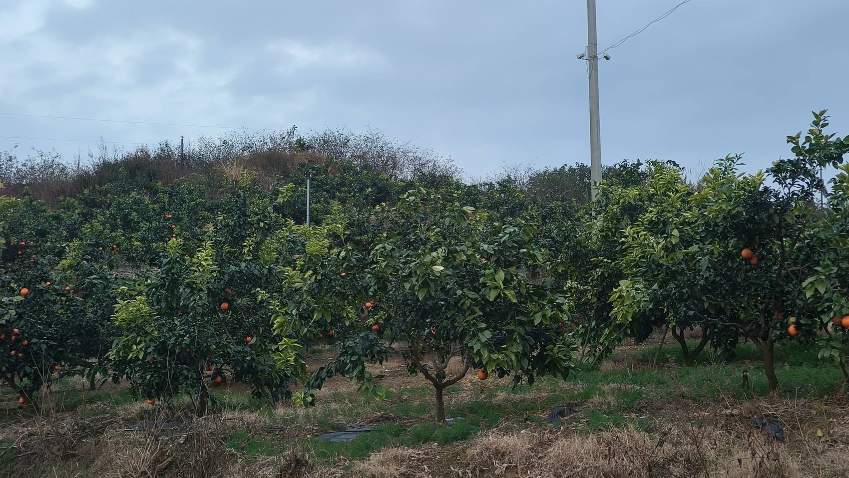 放眼望去,一座低矮的小丘陵上面种满了柑橘树,熟透了的爱媛柑橘黄澄澄挂在枝头。山丘下是两个小小的鱼塘,池塘边已经拉了警戒线。果园门口贴着游戏规则:“入场费8.8元,入园畅吃。未被抓住带走2.5元/斤,被抓住3元/斤。不得破坏果树,不得铺张浪费。不允许殴打、捆绑。”