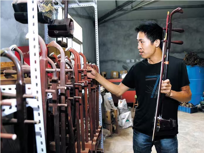如今,罗朝宾一人扛起了二胡制作的重担,并在圈内小有名气。乐器刻有自己独立的LOGO,罗朝宾的二胡通常是通过熟人介绍,通过网店把二胡卖到了全国各地。但他更看重的,是音乐带来的快乐。他组织发动村民学习二胡演奏,积极参加各类演出交流活动。“现在摆弄乐器的村民越来越多,咱村民们也活出了艺术范儿!”罗朝宾满脸笑道。