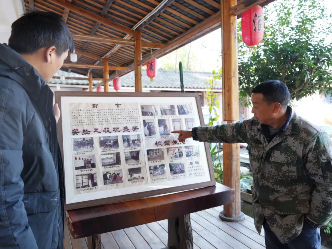 朱光辉俯身细看,手指停在一张泛黄的照片上:简陋的教室里,老师专注地俯身指导孩子做实验。他一眼认出,那些课桌正是用村口古银杏的枝干打成的,照片里有当年教过他的老师。