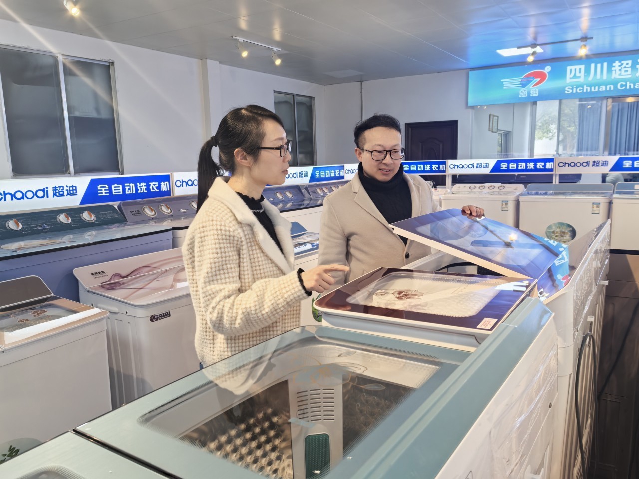 绵阳师范学院智能制造学院博士陈多礼(右)与四川超迪电器实业有限公司副总经理吴冬梅交流产品升级事宜。