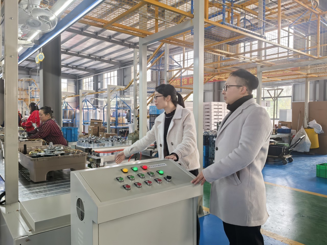 绵阳师范学院智能制造学院博士陈多礼(右)与四川超迪电器实业有限公司副总经理吴冬梅查看智能化产线改造情况。