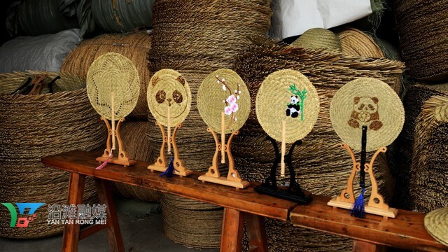 这份“土里生金”的底气,不仅来自灵活的生产模式,更源于产品的文化附加值。郭桃深知,要在国际市场上突围,光靠“便宜”远远不够。“我们的优势是天然、手工、有文化底蕴。你看这个‘太阳神鸟’图案,灵感来自金沙遗址,用传统烙画工艺烫上去的;熊猫和竹子系列,则是外国人一眼就认出的‘四川符号’。”谈及草编“出国”,郭桃感触颇多,“我记得一次接到一笔海外订单有2万个草帽,我高兴坏了!”