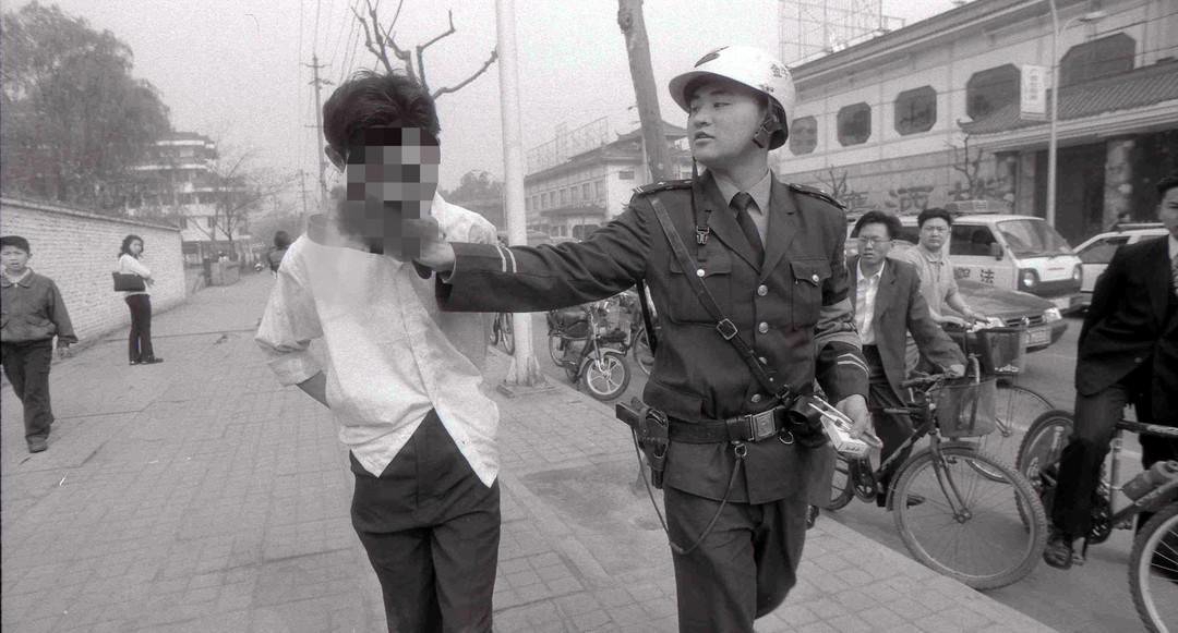 照片于2000年春天摄于成都永陵路,一位年轻警察正抓着一名嫌疑人走在街上,引来不少路人围观。