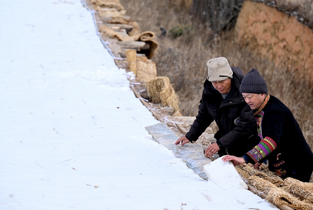 场坝上,当地务工妇女戴着防水保暖手套,将冻得坚实的雪魔芋搬入背篓,送往百米外的晾晒场。“冰冻后的雪魔芋要经过80多天反复翻晒,才能去除多余水分,浓缩风味。”接过父亲手艺的白世强对工序要求严苛。上午10点,零星阳光穿透云层,气温升至5℃,工人们迅速用草席盖住冰冻中的魔芋块,“怕阳光晒黄影响品质,要等风雪来时再掀开。”从4千克鲜魔芋到150克成品,上千小时的风雪交替与匠心守护,终成就金阳雪魔芋筋道弹牙的独特口感。