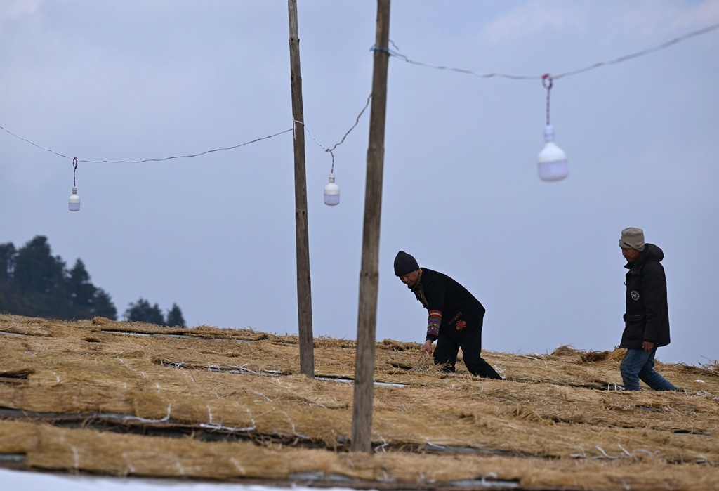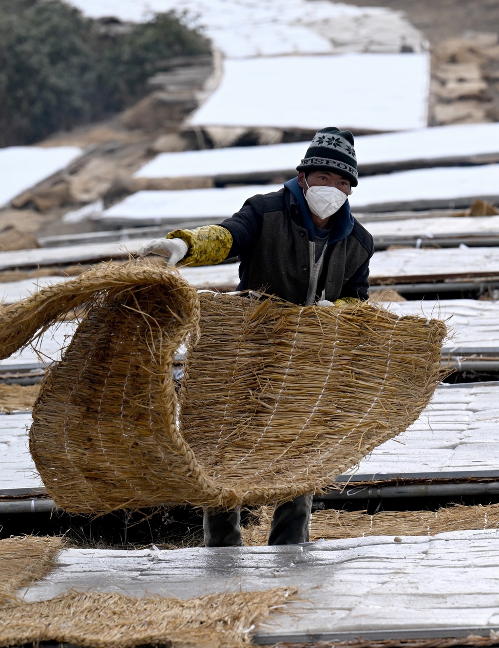 工人们用草席盖住冰冻中的魔芋块,防止融化变质。