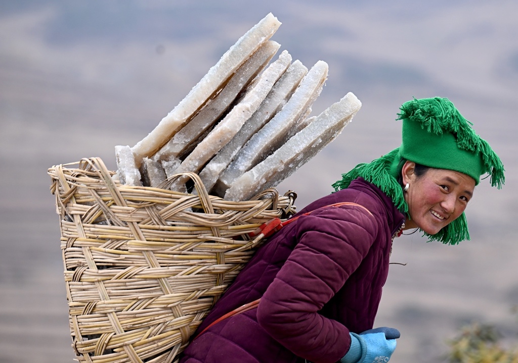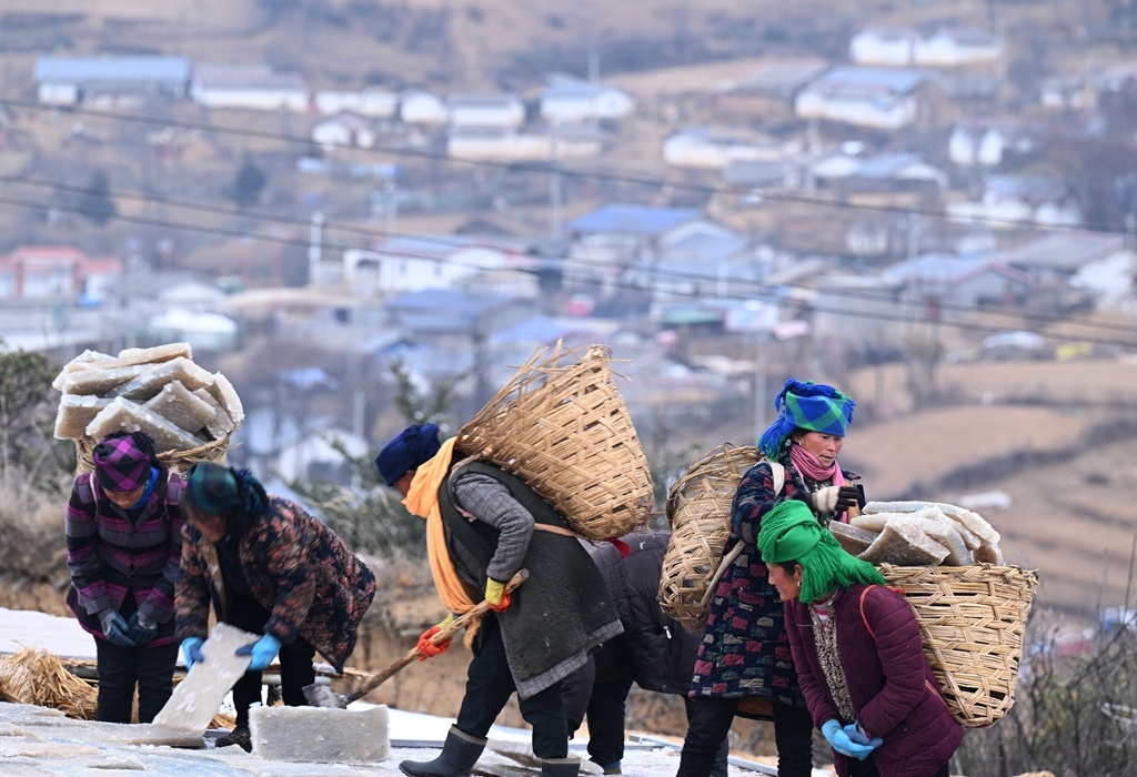 当地务工妇女将冻得坚实的雪魔芋块装入背篓,送往百米外的晾晒场。