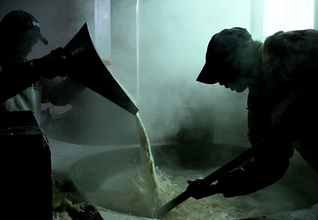 工人们将优质白魔芋粉等原材料倒入锅中,用木质工具不停搅拌至完全融合沸腾。