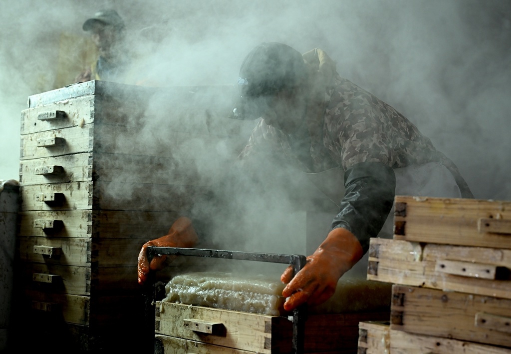 清晨7时50分,加工厂房的烟囱升起炊烟,两口大锅咕咚作响。工人们将优质白魔芋粉等原材料倒入锅中,用木质工具不停搅拌至完全融合沸腾。煮好的魔芋倒入木质框架让其成型,分割成标准尺寸后,经六七十度热水浸泡清洗数分钟,再转运至冰冻场,开启三晚四天的天然冰冻之旅。