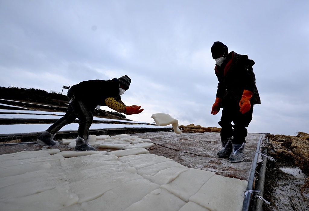 工人们将煮好的魔芋块整齐地码放在冰冻场上,静待风雪的到来。