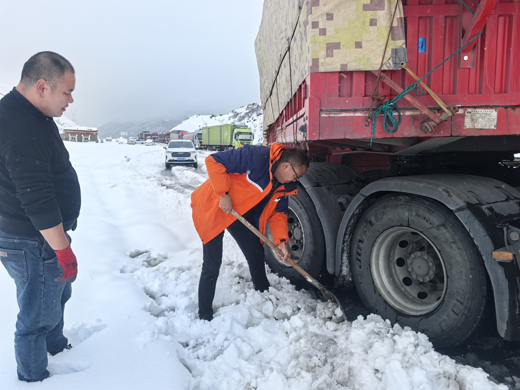 帮助货车司机铲雪脱困。
