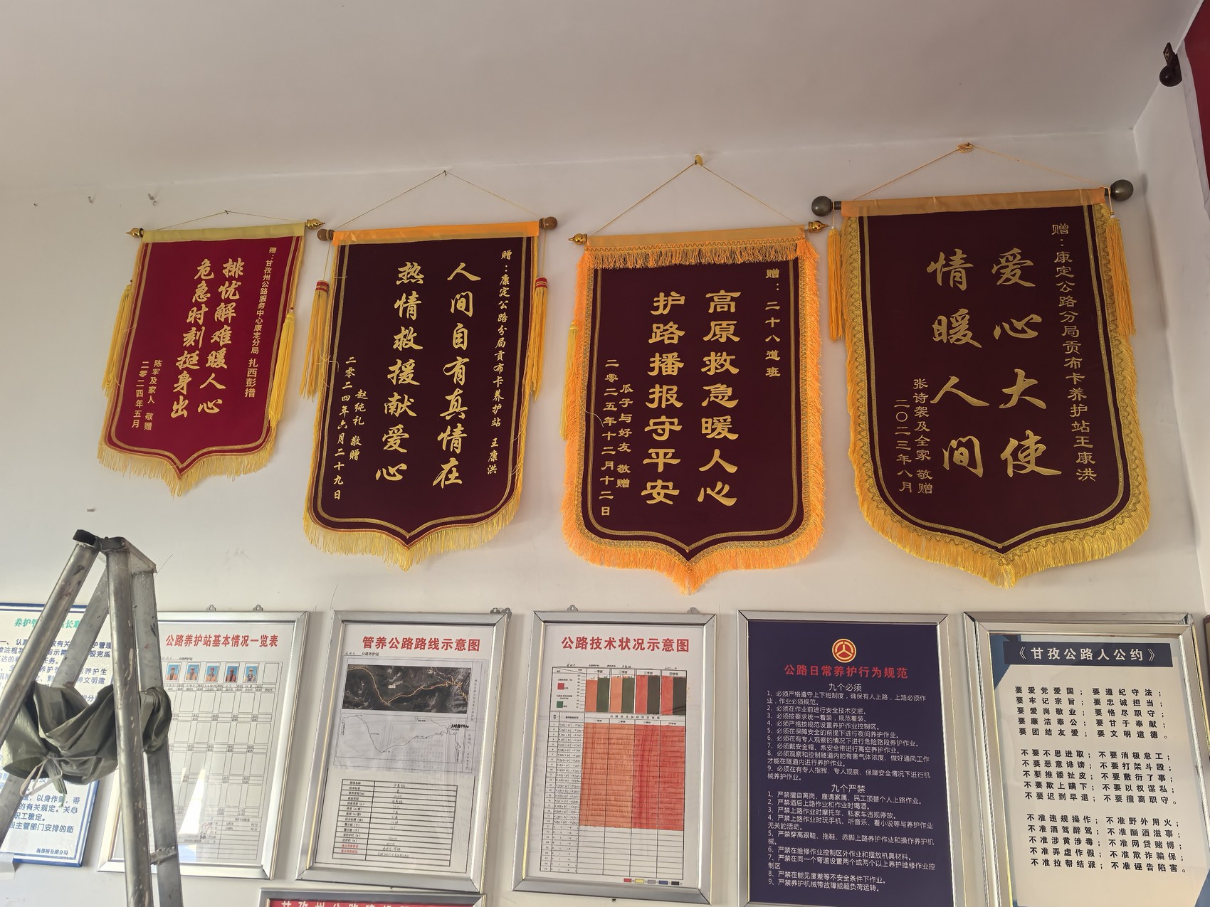 在养护站的一面墙上,还挂着另外几幅锦旗,都是得到王康洪帮助的游客赠送的。其中一幅写着“爱心大使,情暖人间”,锦旗背后的故事让王康洪至今记忆犹深: