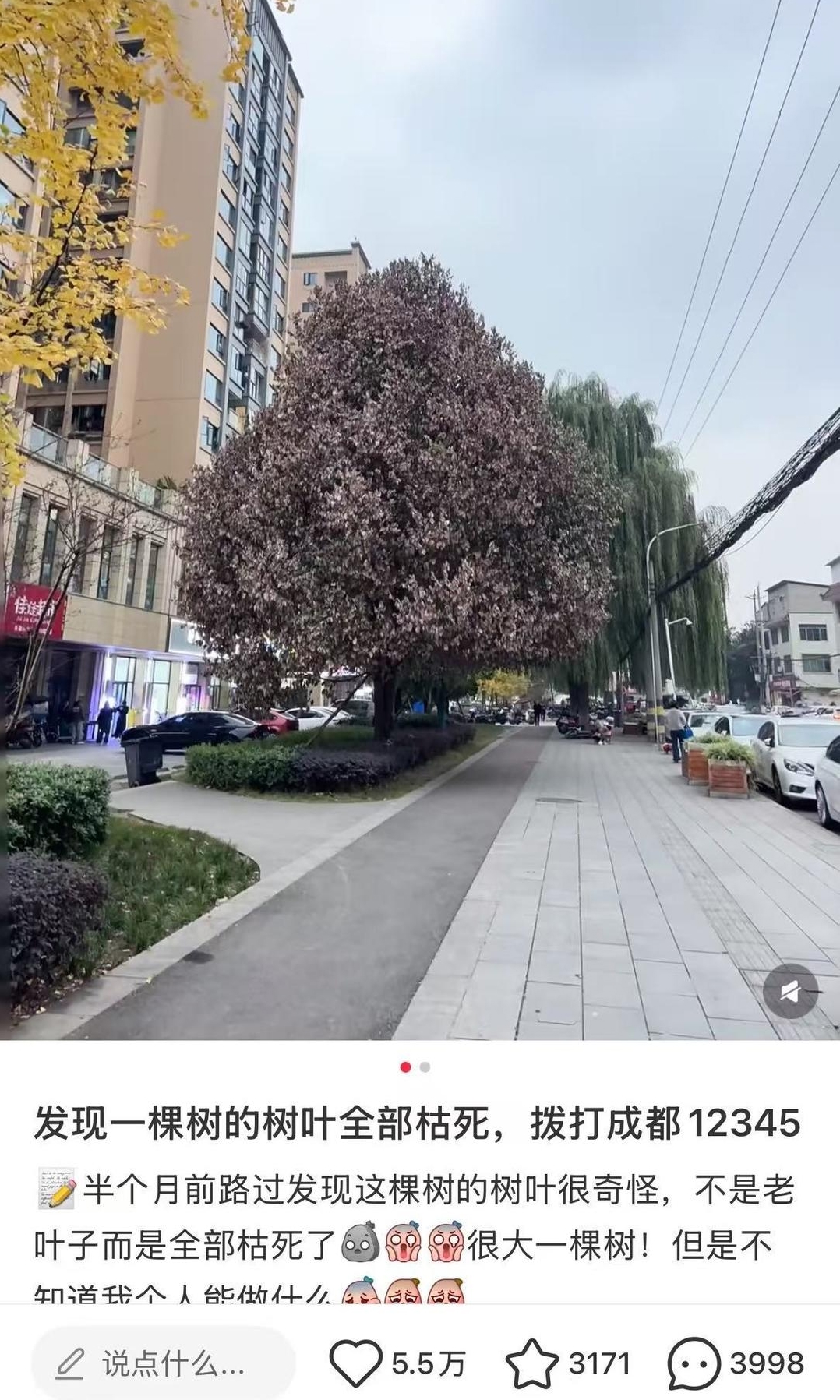 该条帖子的评论区迅速变成了一个温暖的公共空间——有附近居民每天拍摄树木近况上传:“好像有人来看了。”有植物爱好者分析可能病因:“可能是根系问题或病虫害。”更有网友分享同地点树木枝繁叶茂时的照片作对比:“它春天很美,一定要救活啊。”